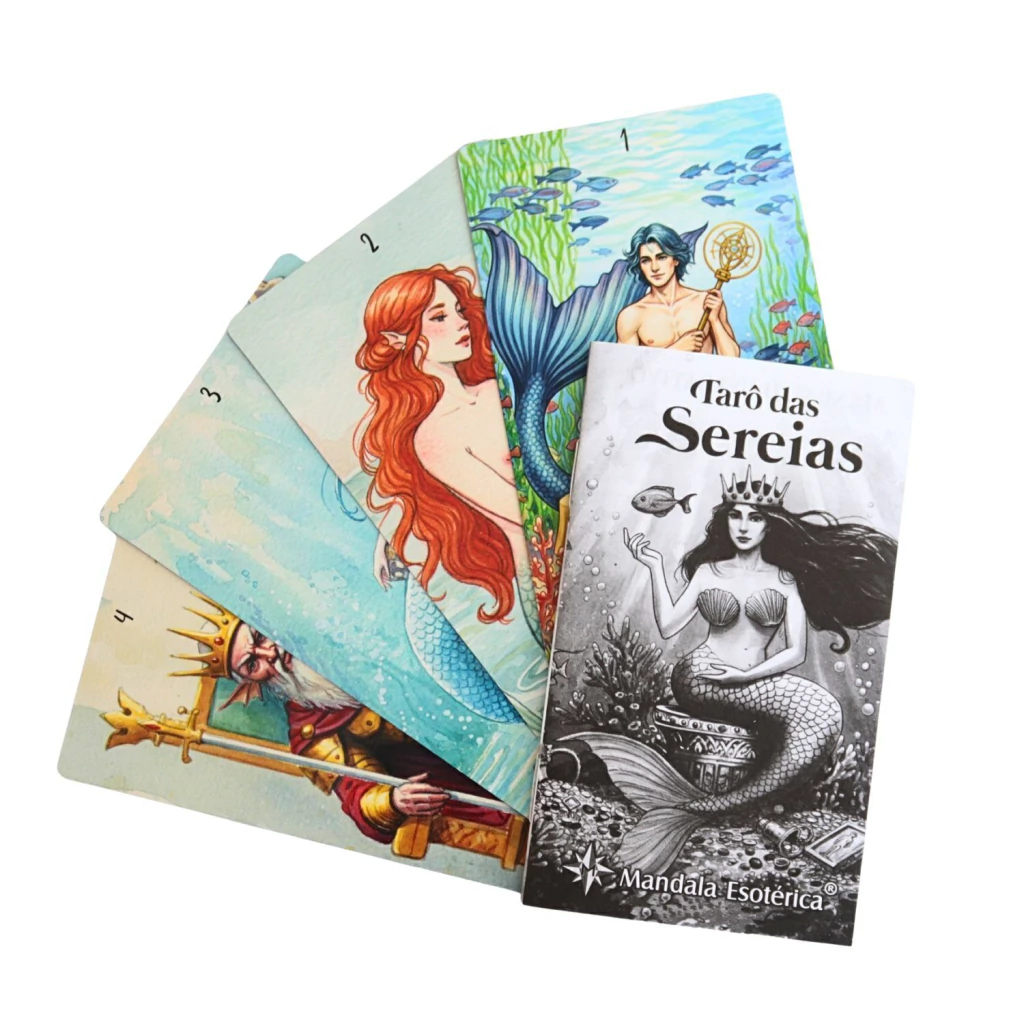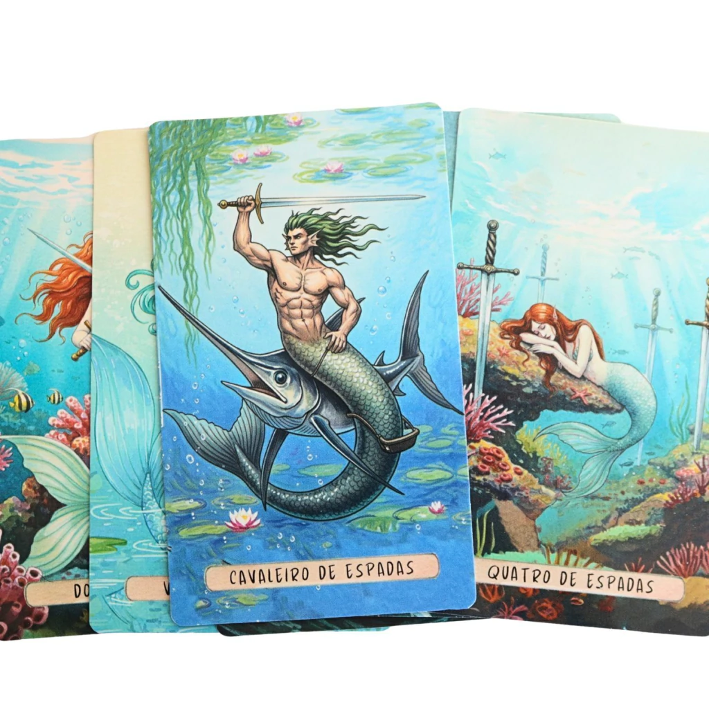 Cada carta traz a imagem de uma sereia ou elemento marinho, representando emoções, intuições e mensagens espirituais.