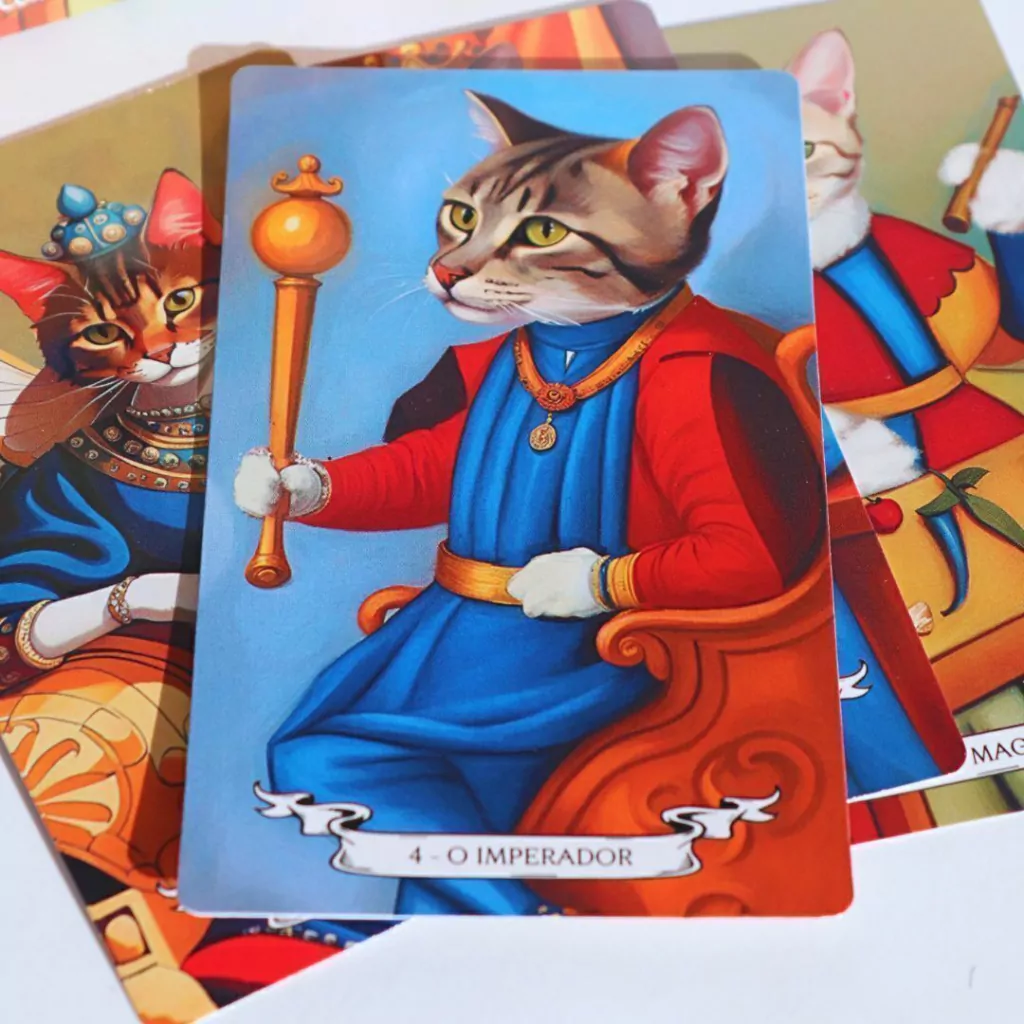 O tarô dos Gatos apresenta imagens desses animais místicos e mágicos e foi projetado para incorporar o simbolismo felino à estrutura tradicional do tarô. Composto por 78 cartas divididas em 22 Arcanos Maiores e 56 Arcanos Menores, cada um com ilustrações exclusivas de gatos representando elementos de O Tarô Clássico de Waite.