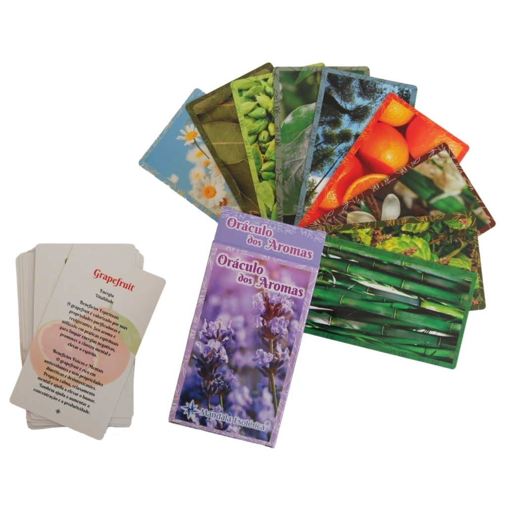 Descubra o Oráculo dos Aromas, um conjunto mágico composto por 54 cartas, desenvolvido para conduzi-lo em uma jornada sensorial única. Cada carta é um canal de sabedoria, projetada para oferecer orientações profundas sobre o uso dos aromas mais poderosos da natureza.