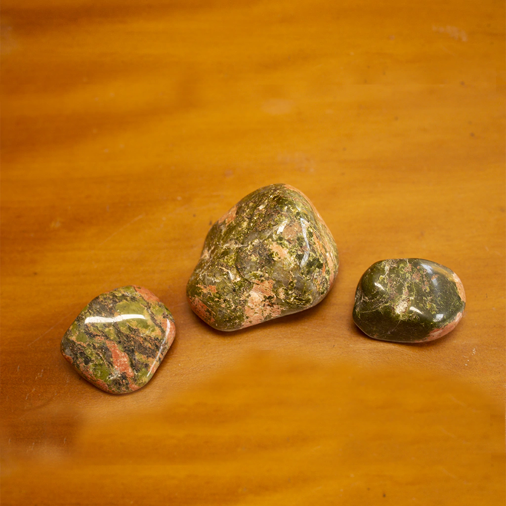Pedra Unakita rolada em tons de verde e de vermelho. É a pedra da visão, que ajuda a equilibrar as emoções com a espiritualidade. Favorece o crescimento espiritual.